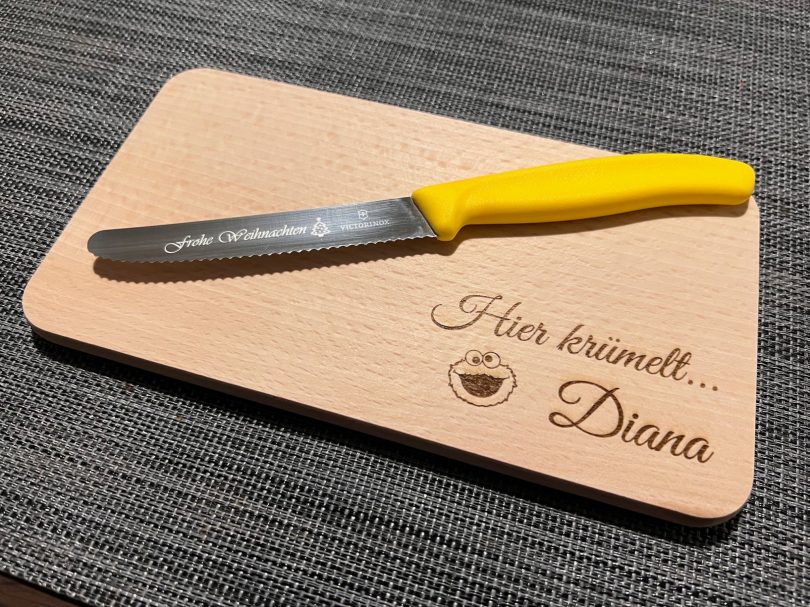 Wählen Sie eine Gravur, die zur Persönlichkeit des Beschenkten passt, und kombinieren Sie Messer und Schneidebrett zu einem harmonischen Set. So wird jeder Moment am Küchentisch zu etwas Besonderem.